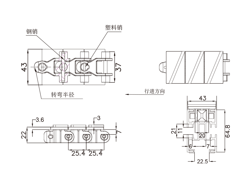 型号 材质 钢销尺寸 宽度 节距 最小侧弯半径 提升挡板高度 重量