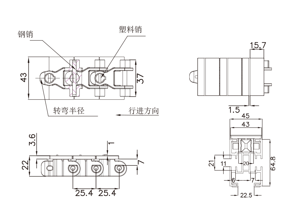 型号 材质 钢销尺寸 宽度 节距 最小侧弯半径 提升挡板高度 重量