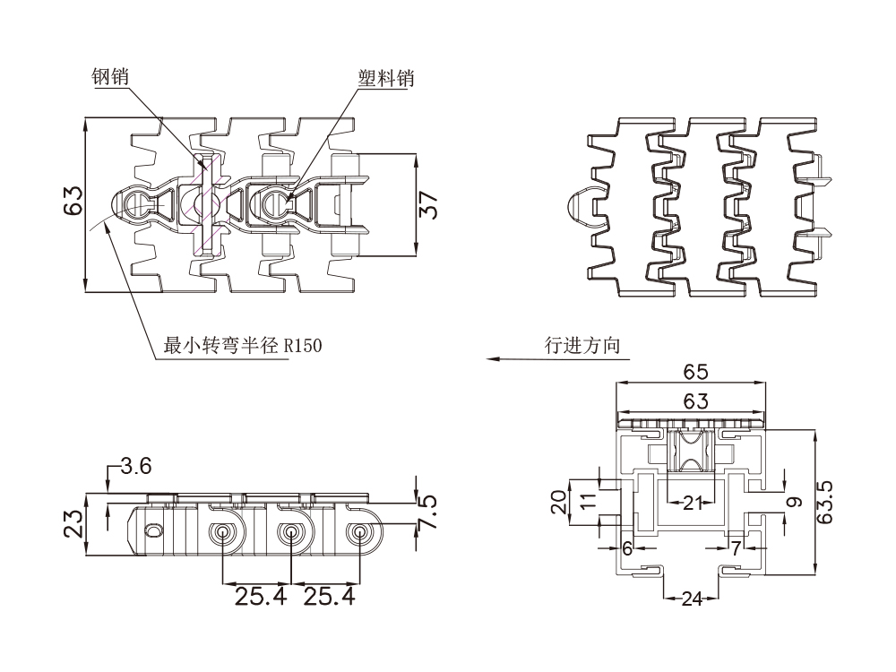 63平板链 主体 塑料销轴 插销 mm mm mm mm kg/m