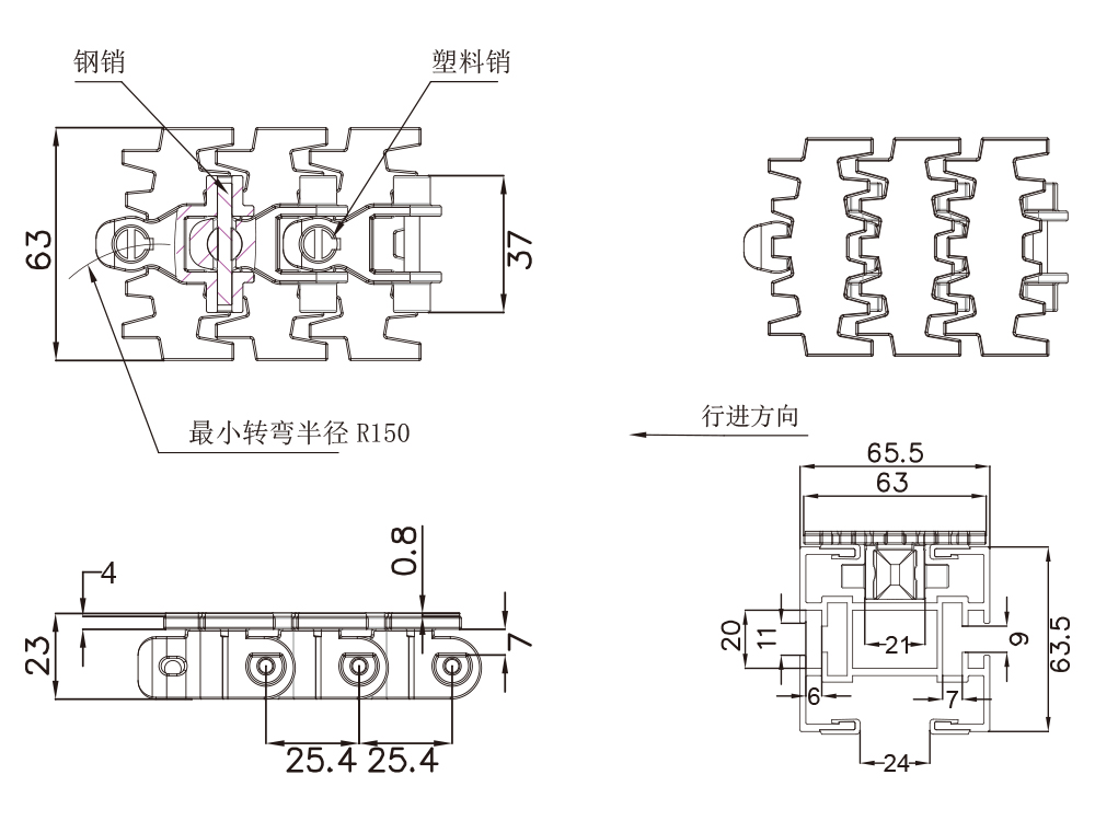 型号 材质 钢销尺寸 宽度 节距 最小侧弯半径 重量