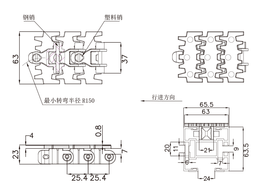 4. 4、63宽链板1米长由39小节单片链板组成。