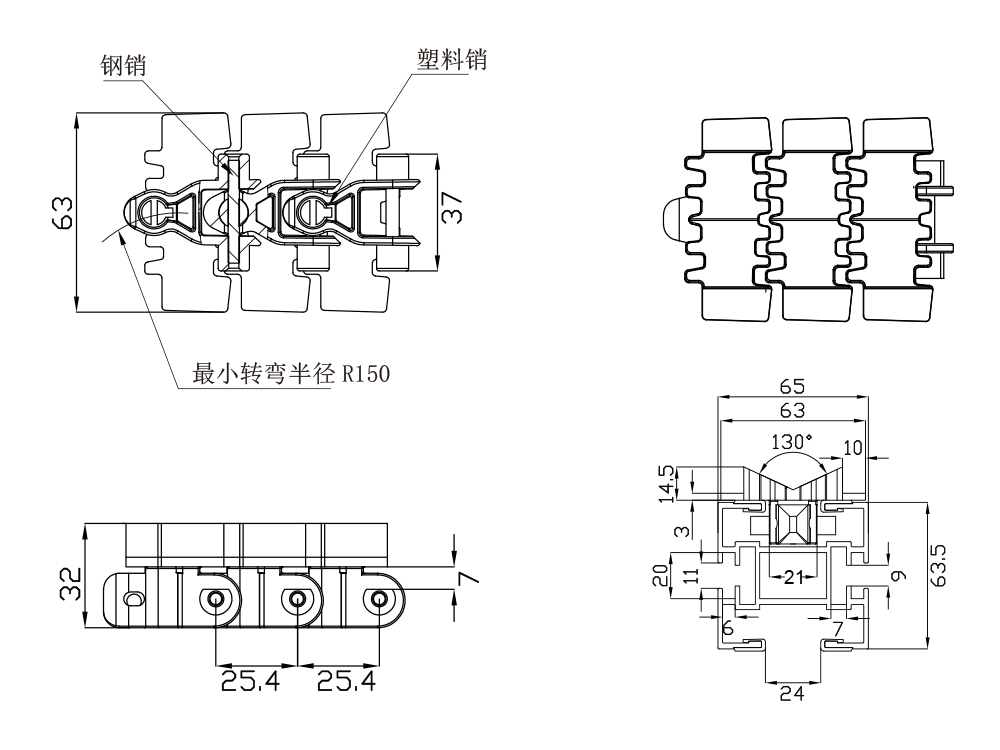 63V型链A 主体 塑料销轴 插销 mm mm mm mm kg/m