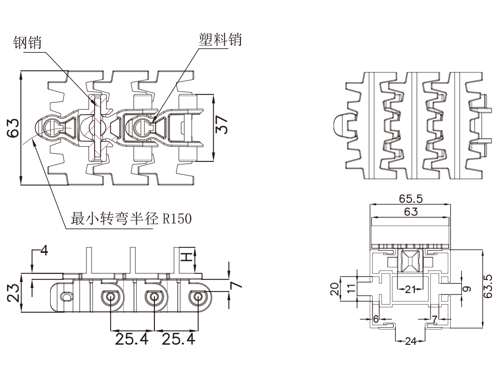 型号 材质 钢销尺寸 宽度 节距 最小侧弯半径 提升挡板高度 重量