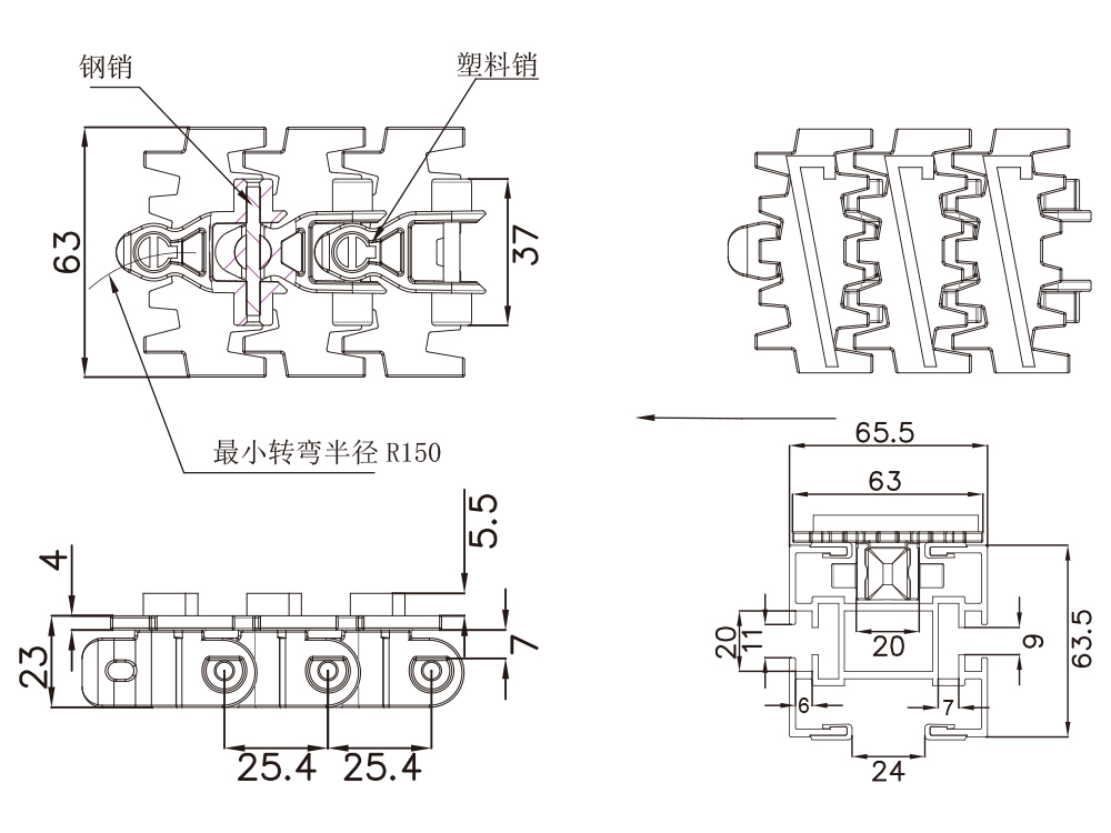 型号 材质 钢销尺寸 宽度 节距 最小侧弯半径 提升挡板高度 重量