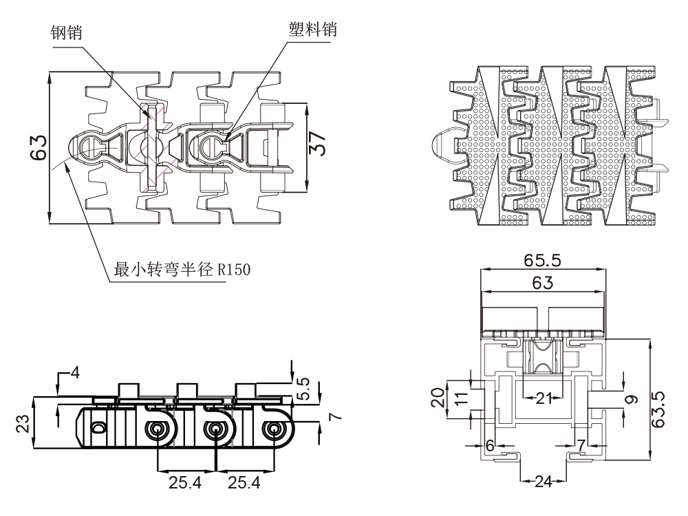 4. 4、63宽链板1米长由39小节单片链板组成。