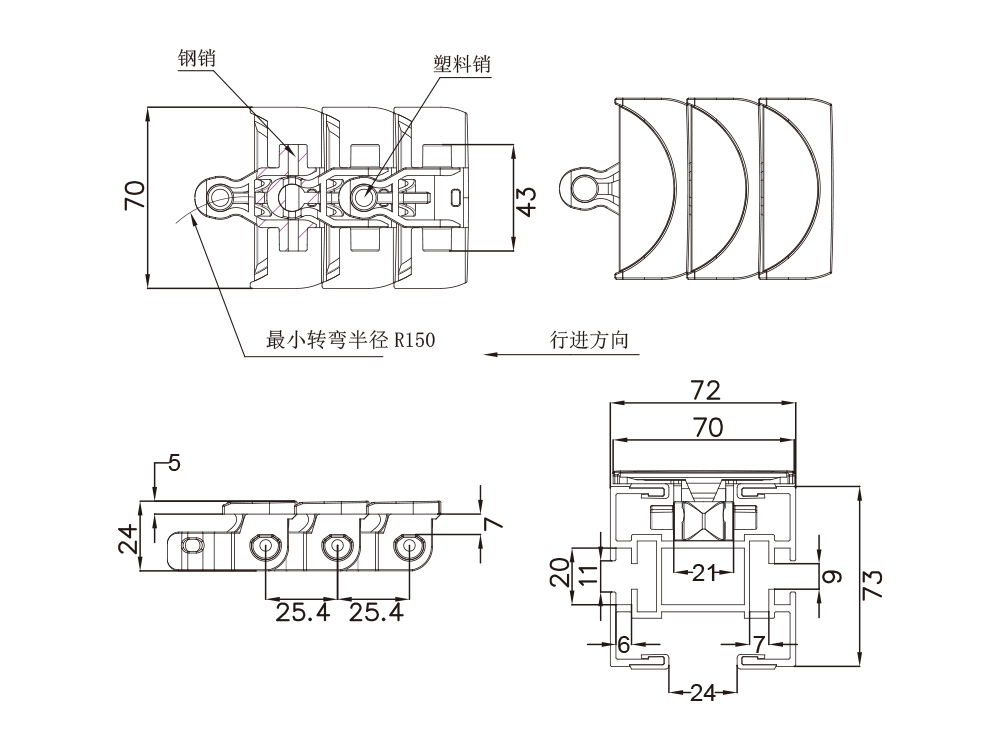 4. 4、70宽链板1米长由39小节单片链板组成。