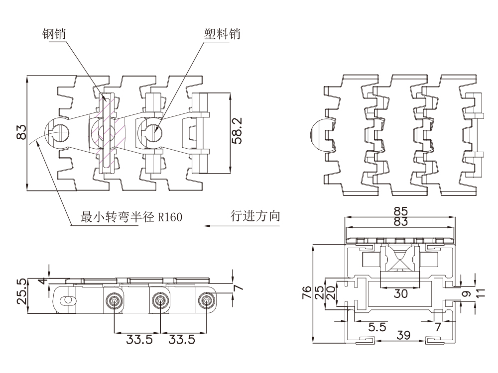 型号 材质 钢销尺寸 宽度 节距 最小侧弯半径 重量