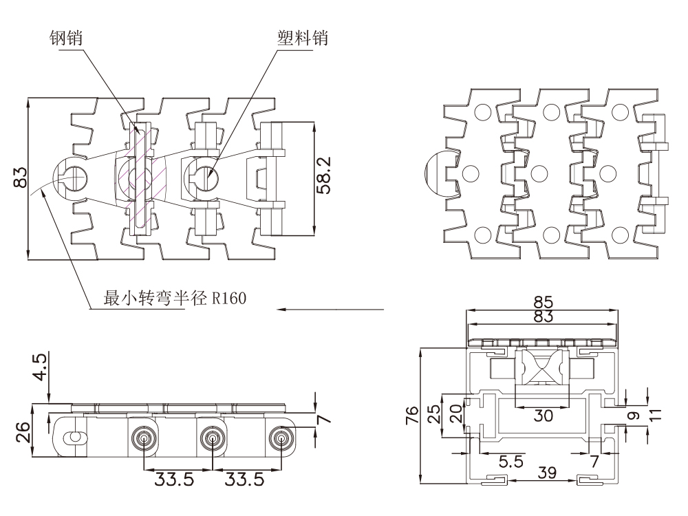 型号 材质 钢销尺寸 宽度 节距 最小侧弯半径 重量
