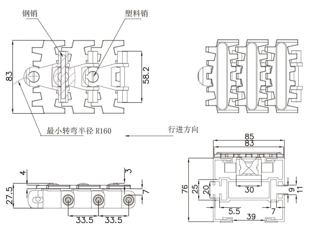 4. 4、83宽链板1米长由30小节单片链板组成。