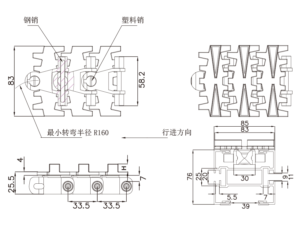 型号 材质 钢销尺寸 宽度 节距 最小侧弯半径 提升挡板高度 重量