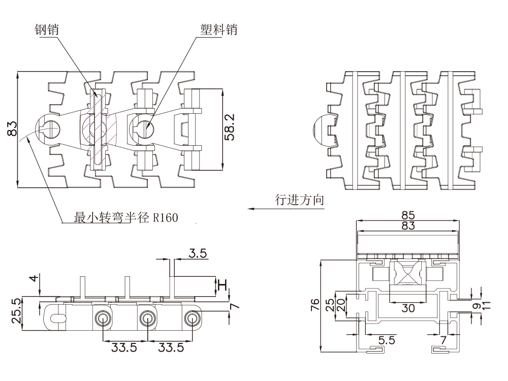 型号 材质 钢销尺寸 宽度 节距 最小侧弯半径 提升挡板高度 重量