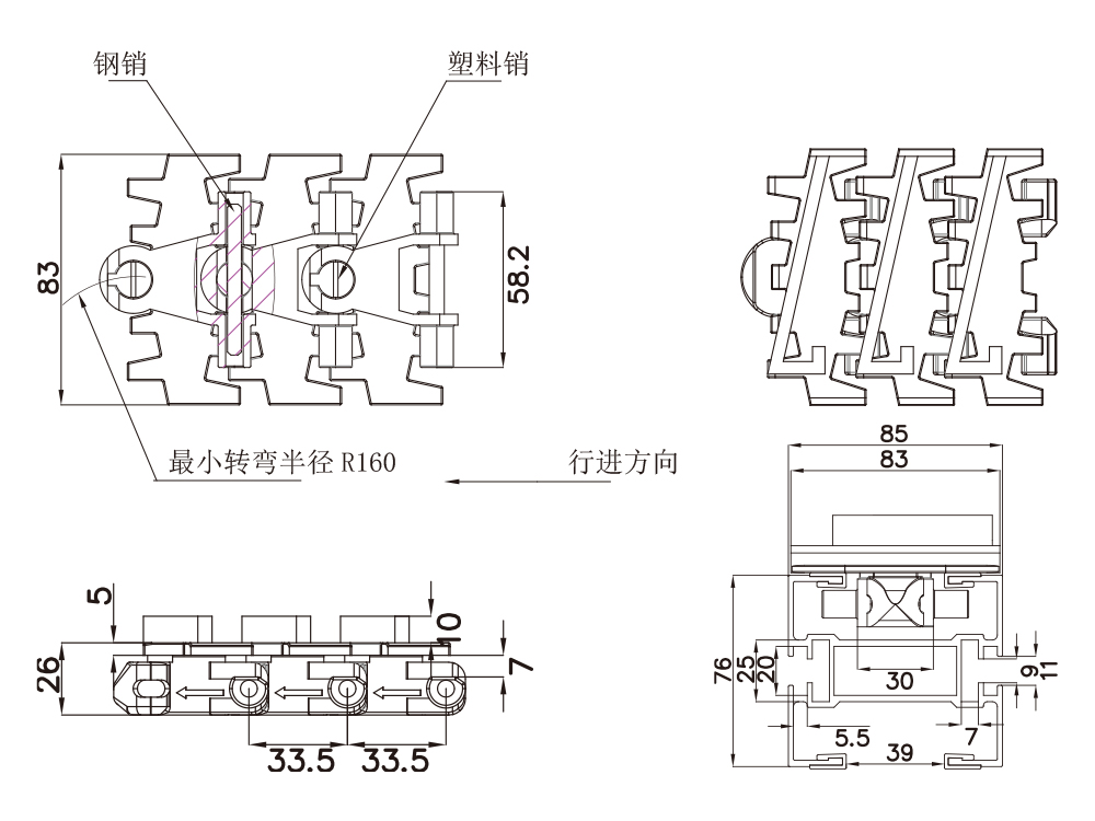 型号 材质 钢销尺寸 宽度 节距 最小侧弯半径 提升挡板高度 重量