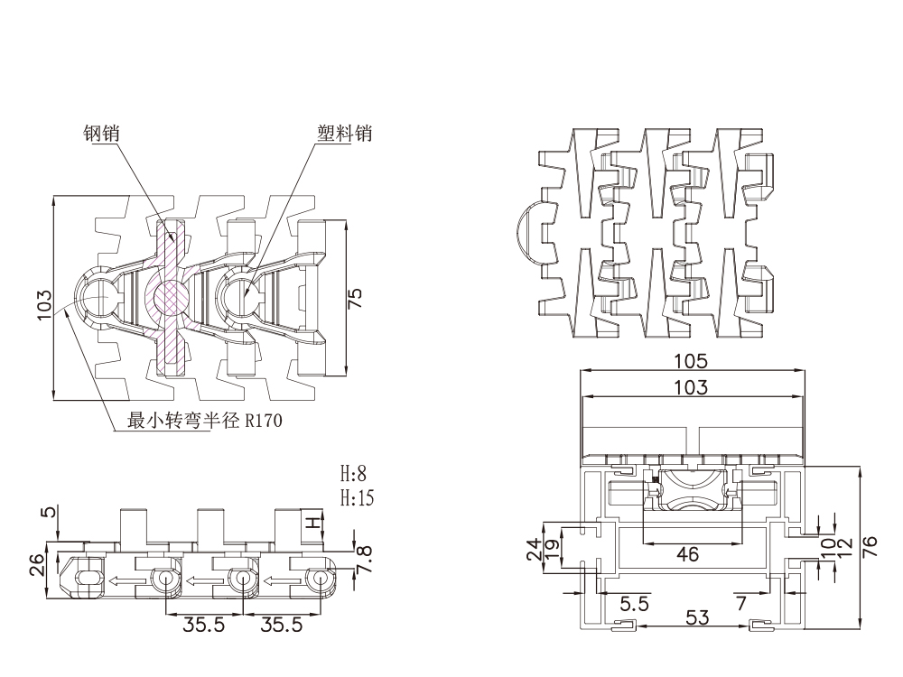 型号 材质 钢销尺寸 宽度 节距 最小侧弯半径 提升挡板高度 重量