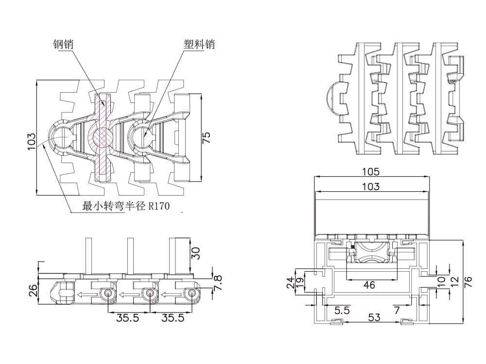4. 4、103宽链板1米长由28小节单片链板组成。