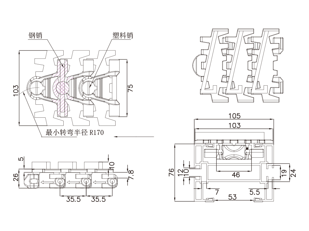 4. 4、103宽链板1米长由28小节单片链板组成。
