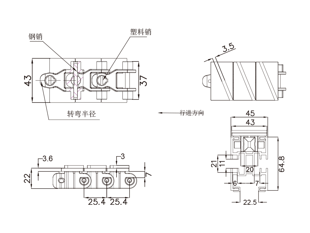 型号 材质 钢销尺寸 宽度 节距 最小侧弯半径 提升挡板高度 重量