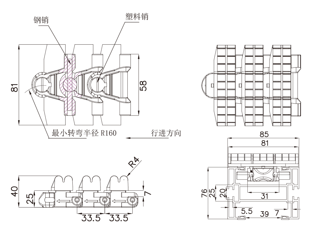 型号 材质 钢销尺寸 宽度 节距 最小侧弯半径 重量