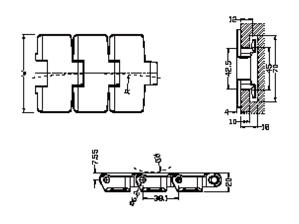 型号 链板宽度W 网链重量 最小转弯半径 链板材质 工作载荷 销轴材质 节距 销轴直径 背弯半径(最小值)
